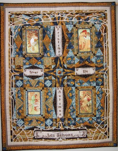 Dit is Les Saisons Art Nouveau, met speciaal voor deze quilt geprinte plaatjes van Alphonse Mucha de seizoenen. Uitgevoerd in stoffen van Moda Barbara Brackmann Morris Earthly Paradise. In het centrum van de ster een vintage glasknoop met een libelle. Geinteresseerd? Er zijn nog een paar plaatsen vrij