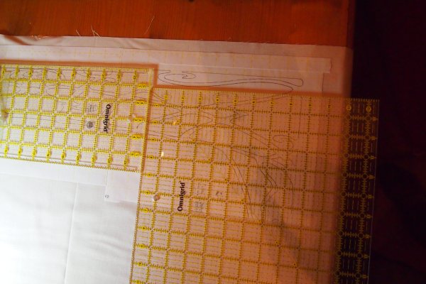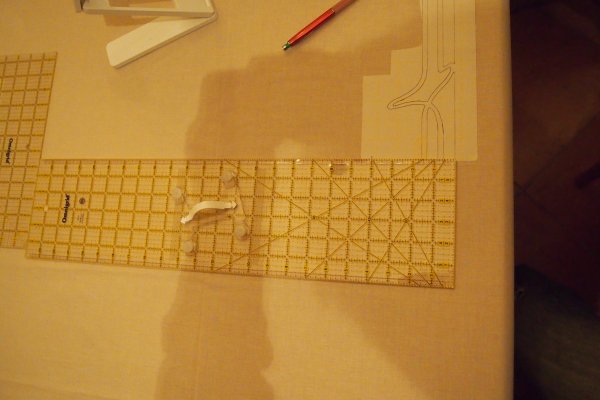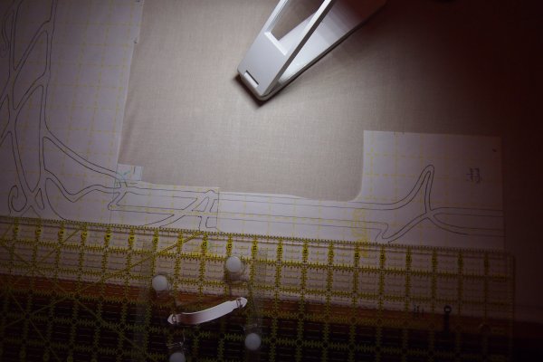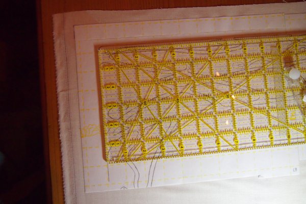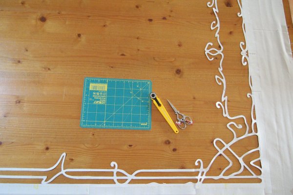 Allereerst de stof met de goede kant naar beneden op een vlak oppervlak (bijvoorbeeld op een tafelblad) strak vastplakken met brede tape.
