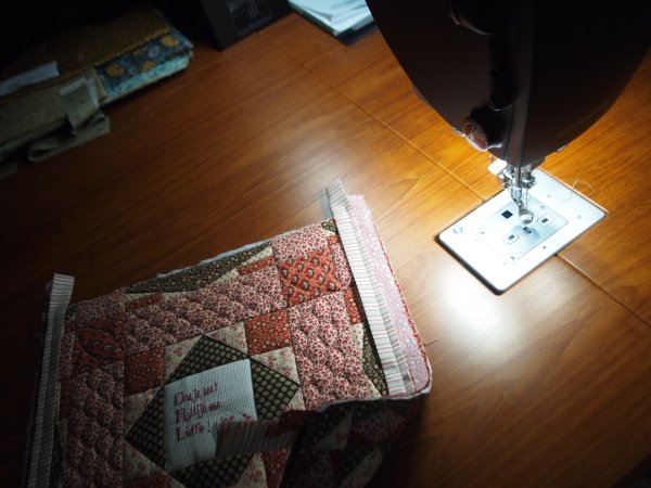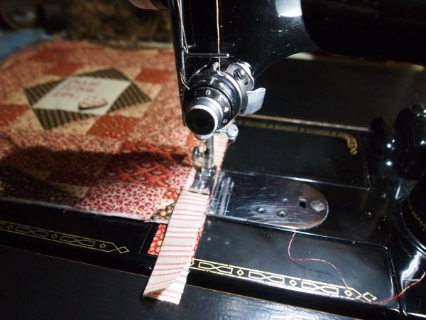 De strips zijn vastgezet met spelden en worden nu vastgenaaid met de Singer. Wij gebruiken hier een 1/4 inch naadtoeslag voetje. Let op dat de vouw van de sashing naar links wijst