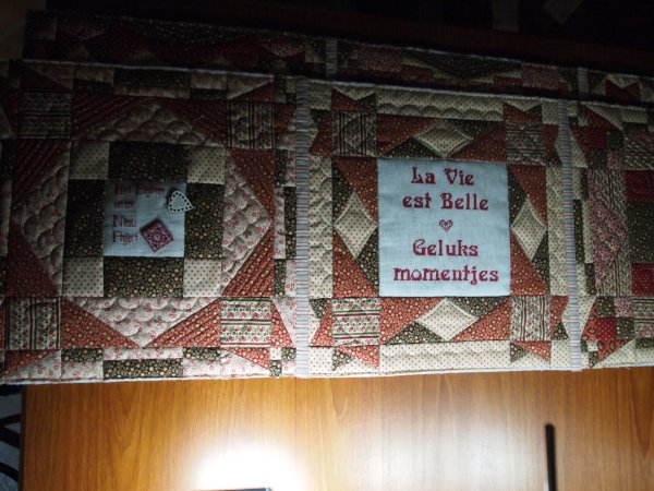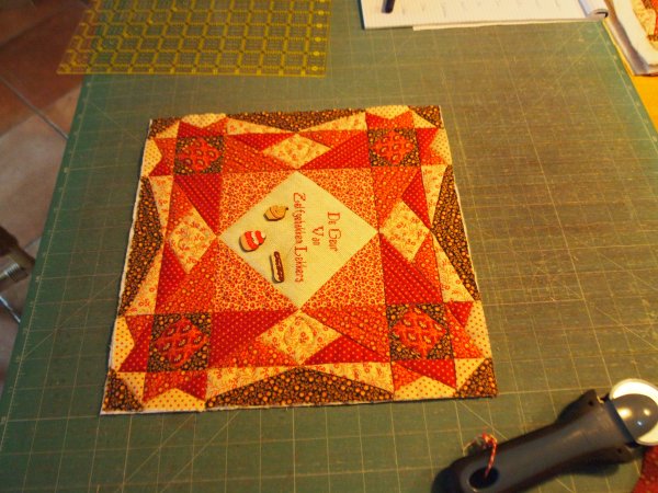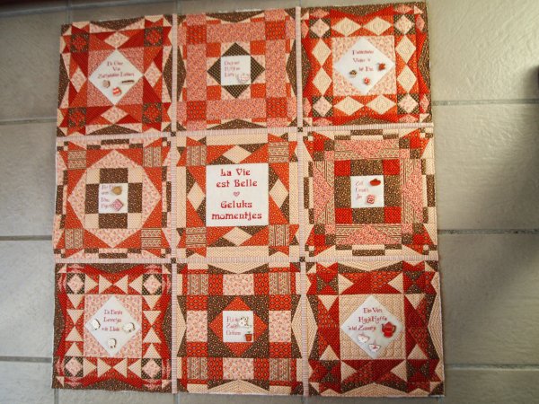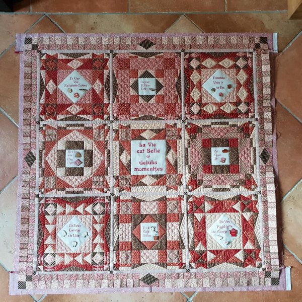 Op de quilt wordt in elk borduurvlak een tekst geborduurd met bijbehorende "Boutons" van