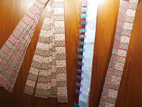 De borderstroken maken. Eerst de "zebrapaden" maken en daarna doorsnijden (8 stuks binnenrand en 8 stuks buitenrand).Daarna de binnen en buitenstroken per set aan elkaar zetten. Kost een hoop spelden en wonderclips, maar dan liggen alle kruispuntjes wel mooi op elkaar: