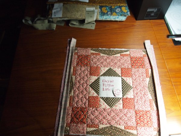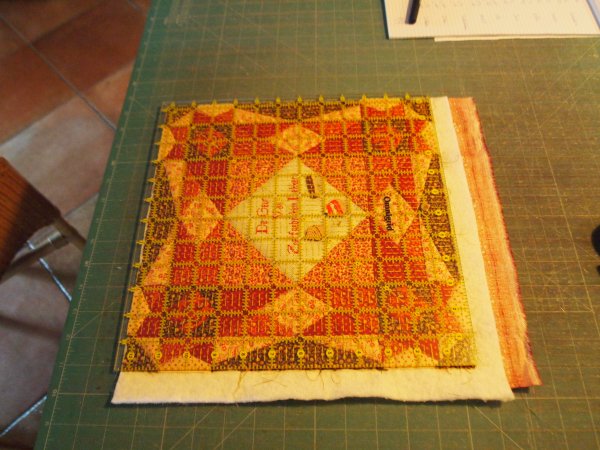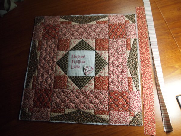 En dit is de quilt voorzien van buiten sashing randen, de borders en de achterkantstof. Klaar voor het laatste deel het quilten van de borders.