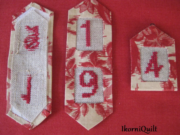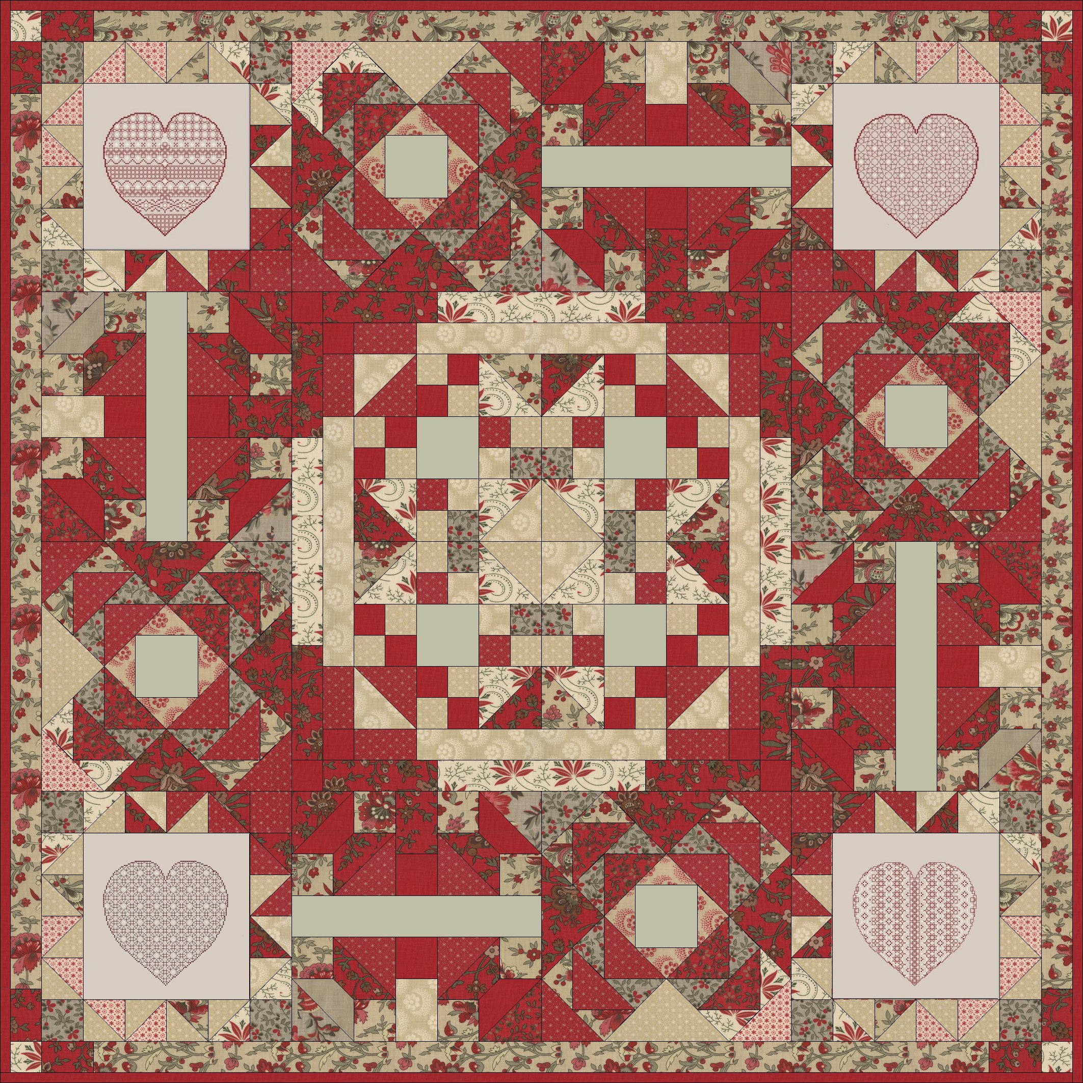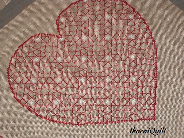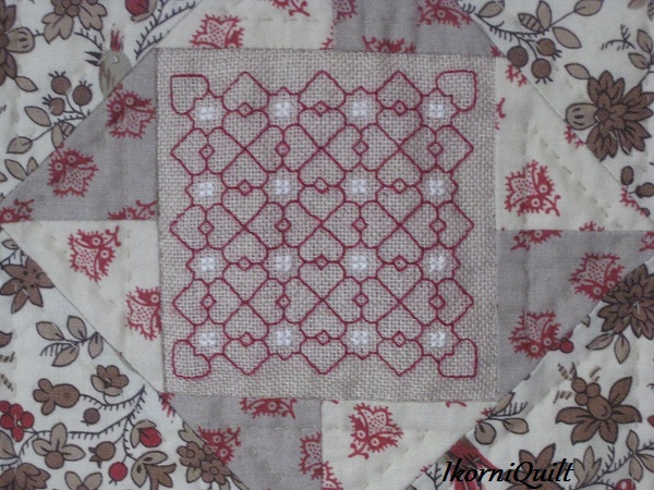 10 maanden, 4 hoekblokken met een kruissteek/ blackwork hartenmotief, en 6 blokken sets van 2 blokken.