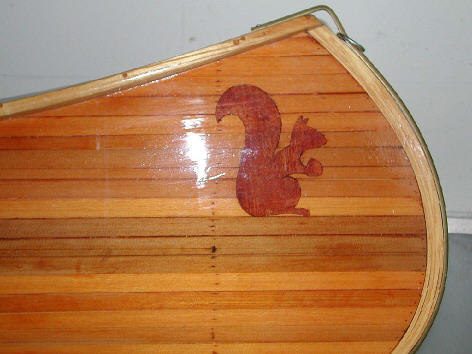 Detailfoto boeg met ingelegde mahonie-fineer eekhoorn.
