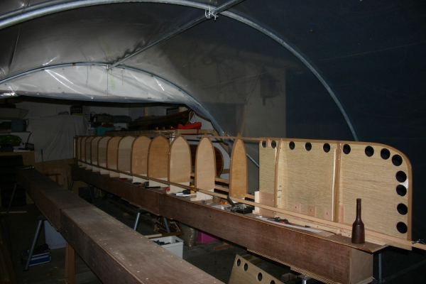 De "stitch and glue"panelen van de centrale romp liggen klaar om verlijmd te worden.